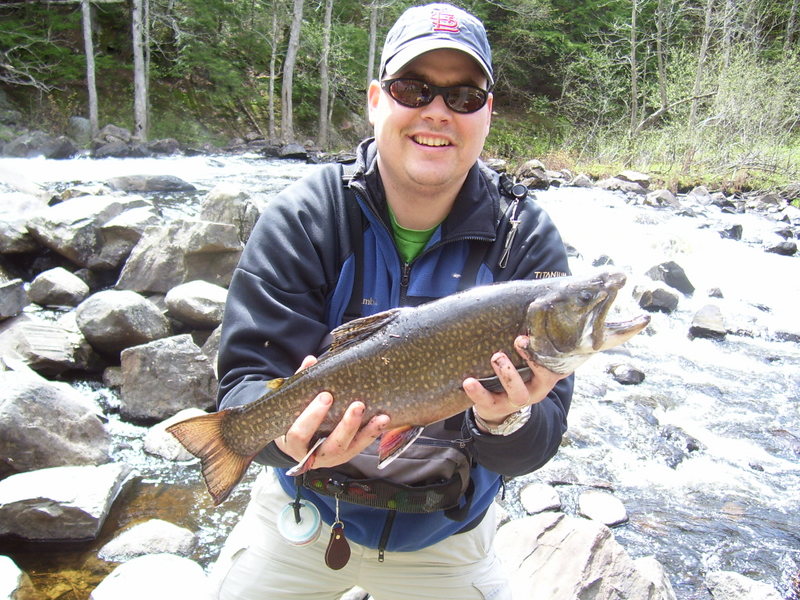My wife and I decided to head to Algonquin Park as it was relatively easy to get to from where we were staying. I took my clunky 4wt setup with me, used the clear intermediate line I bought in London, England (always check the bargain bin!), tied on a 5x tippet and the only white muddler minnow in my fly box. I didn’t even put on my waders as we were only going to be there for a few minutes and there really was no point. Due to the size of the fly and my terrible casting ability, I got hung up in a few trees and really struggled to get my fly out. After casting into the pool above and almost smoking myself in the head, I forcefully cast cross the stream and let me fly drift into the pool. After three short strips, WHACK! It was a hit I hadn’t experienced since my first Steelhead on a roe bag. After a good 10 minute fight (which felt like an hour!) I finally brought the fish to the net. Prior to this, the biggest brookie I had ever landed was about 8″. When I finally got the fish in the net I let out a huge yell and my wife told me that I was ridiculous. She asked me why I was shaking and then I told her about the tiny trout I’ve caught in the past and how this was unique.