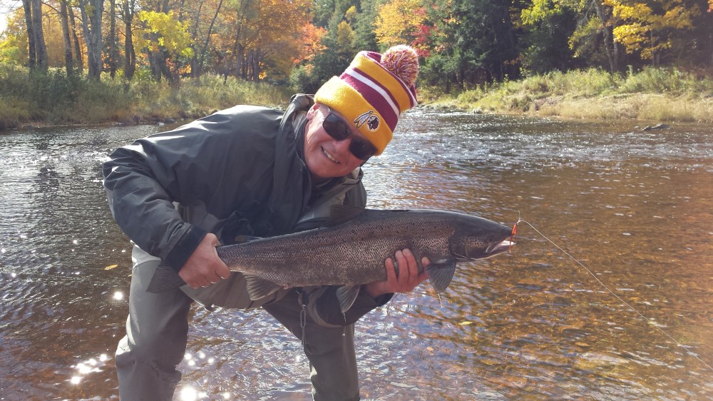 Humility aside, his next cast was a beauty. I’m not sure if he was really paying attention as we were in the midst of a somewhat jokingly heated discussion about football. Just then, he hooked into the first Atlantic Salmon that I would see in person. While Greg was a fit gentleman, the current was not helping so I waded in to help him out. I hooked his arm and we carefully made our way across the river and onto shore. The fish went on multiple runs and leaped well over 6 feet out of the water on multiple occasions. I was mesmerized. While it did not take him into his backing at all, it fought a fierce game up and down the river and under the opposite bank which was full of deadfall. Once back on the bank, he continued to fight the fish for another 10 minutes at which point I helped him land this dark and beautiful fish: